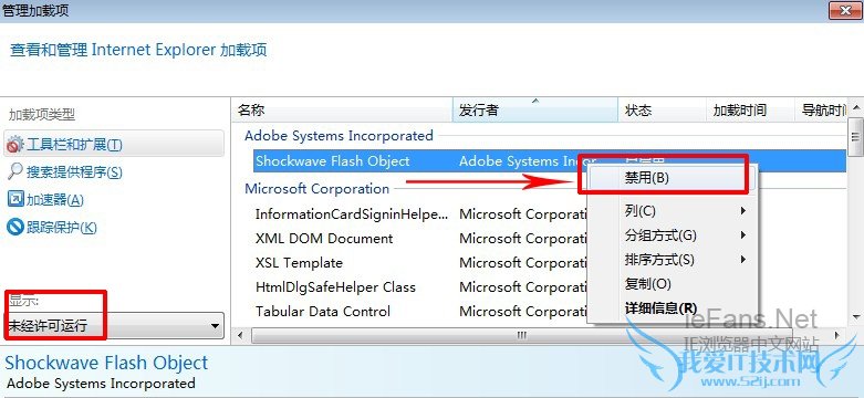4.在右边可以显示出未经许可运行的插件,鼠标移动到需要禁用的插件名上单击鼠标右键,选择“禁用”。