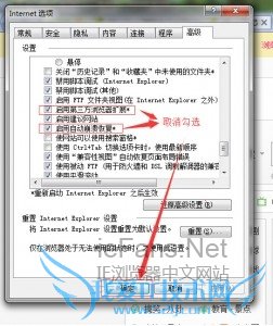 打开IE11浏览器点“设置→Internet选项”,进入高级选项,取消“第三方浏览器扩展”和“自动恢复浏览器崩溃”的勾选(图示)。