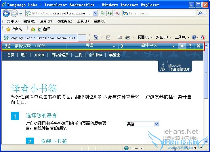 1、在IE浏览器中打开译者小书签网站:http://labs.microsofttranslator.com/bookmarklet/