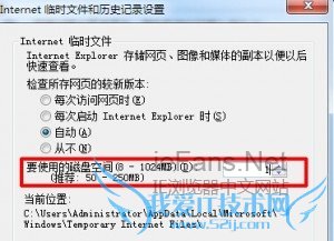 1.在IE浏览器中的工具栏中,打开Internet选项,在其中的常规选项中的“浏览历史记录”中的“设置”里,修改使用的磁盘空间。<>