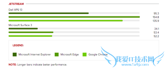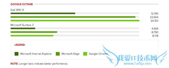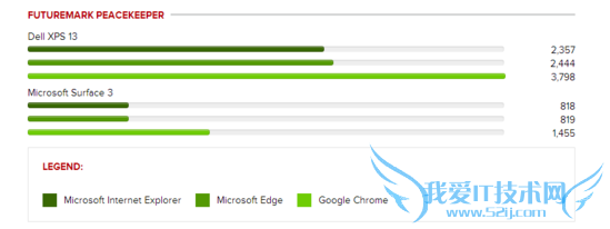 在浏览器性能测试中采用了Dell?XPS 13,它配有最新的英特尔i5 CPU,低端机则用入门级别的Surface 3做代表,它使用的是英特尔Atom处理器。