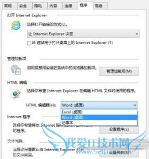 好在IE11本身也为我们提供了快速修改编辑器的方法,我们可以打开Internet 选项,在“程序”选项卡中,用户还可以修改HTML 编辑器,仅有少数可选值。