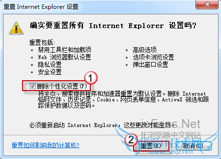 3、从弹出的重置对话窗口中,勾选“删除个性化设置”,然后再次点击“重置”。