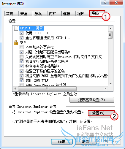 2、在“高级”选项卡上单击“重置”按钮(若提示您先关闭窗口,请先关闭其他打开的窗口)。
