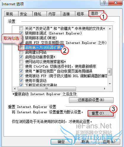 再次打开“高级”选项卡,找到“启用第三方浏览器扩展”设置并去掉之前的勾选框,然后点击“确定”保存更改。