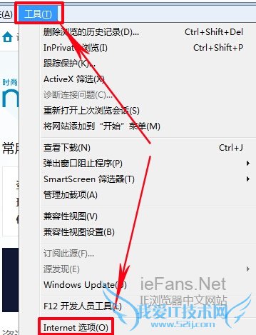 1.打开IE浏览器,在工具栏中找到“Internet选项”<>