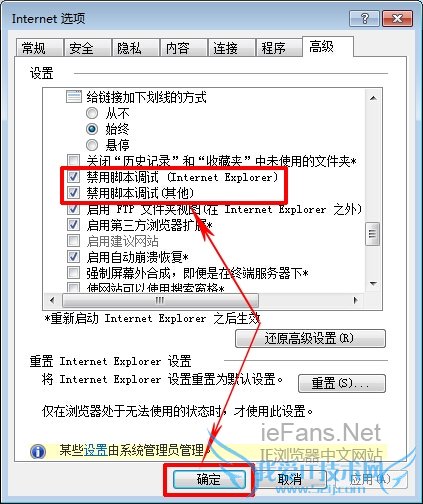 3.然后在其中找到“禁用脚本调试”两项,都选中。然后点击确定。