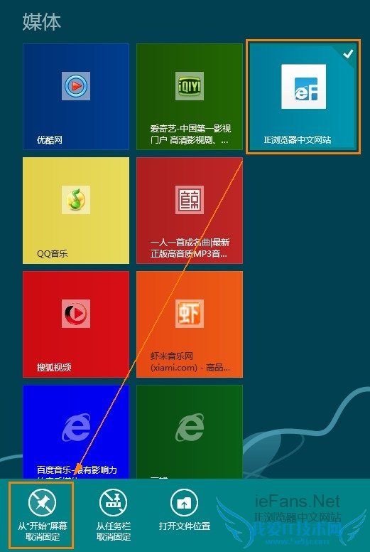 将鼠标放置到这个磁贴上,然后单击鼠标右键,选择“从“开始”屏幕取消固定”就可以将这个快捷方式从开始屏幕界面中去除了。
