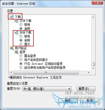 3. 在 [安全设定] 视窗中,滚动到 [下载] 区域,参考以下说明设置 [字体下载] 的方式,设置完全后单击 [确定] 按钮。