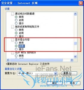 3、在这里找到“显示混合内容”这项,将“提示”改成“启动”就OK了。