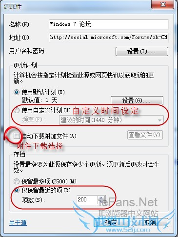 在“源属性”对话框中,你可以更改信息更新时间,设定是否需要下载附件,以及保留几个更新项的设置。