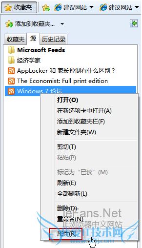 打开“收藏夹”〉“源”;将鼠标落在目标订阅源上, 右击,选择“属性”。
