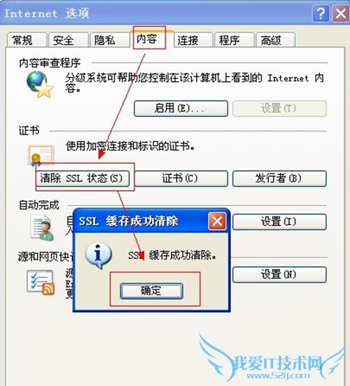 4、点击“内容”,选择页面中的“清除SSL状况”,在弹出的对话框提示中,点击“确定”即可。