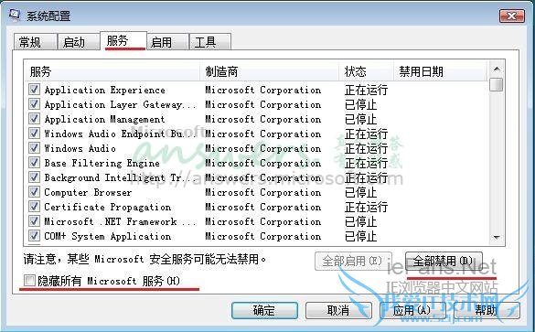 3、单击“服务”选项卡,单击以选择“隐藏所有 Microsoft 服务”复选框,然后单击“全部禁用”。