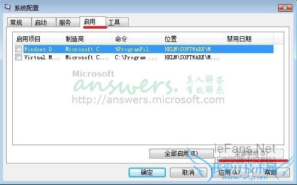 4、单击“启用”标签卡,然后点击“全部禁用”并确定。