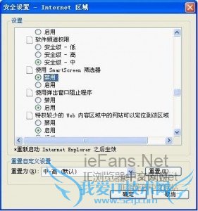 打开IE8,选择“工具”菜单”→“Internet 选项”→“安全”→选择“Internet”→“自定义级别”,找到“使用 SmartScreen 筛选器”,再选择禁用,然后确定后在重启IE浏览器,大多数情况下您可正常访问该网站了。