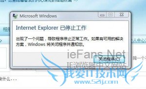 Internet Explorer 已停止工作 出现了一个问题,导致程序停止正常工作。如果有可用的解决方案,Windows将关闭程序并通知你。