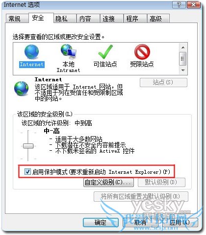 2.打开“安全”选项卡,将“本地连接”和“Internet连接”下的“启用保护模式”前的勾选项去掉。 <>