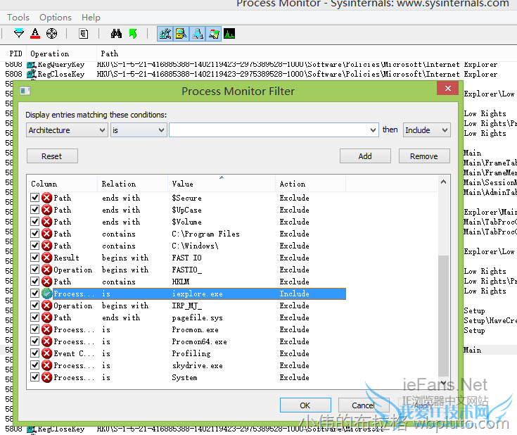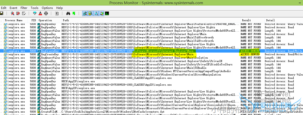 怀疑六:当前用户的注册表数据出问题了。于是,打开进程监视器,监视IE进程的行为,看看是否有异常: