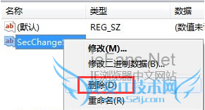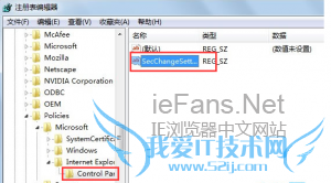 2、找到HKEY_CURRENT_USERSoftwarePoliciesMicrosoftInternet Explorer Control Panel,在右侧窗口中右击SecChangeSettings,将其删除。