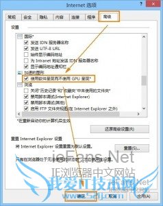 3. 选择“Internet”选项中选择“高级”选项卡,在设置窗口中做相应的设置,目前比较多的设置为加速的图形下“使用软件呈现而不使用GPU呈现*”。