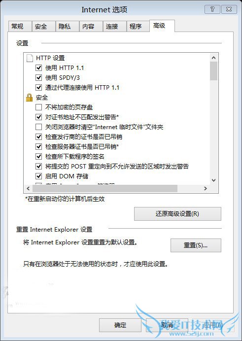 如果Internet Explorer停止响应或停止工作,如果遇到指示需要关闭Internet Explorer的错误,或者如果浏览速度变慢,则可能需要重置Internet Explorer设置。在您重置Internet Explorer设置后,它简直就像刚开始使用新版本的Internet Explorer一样好用。(操作如下:打开Internet选项,切换到高级页面,即可完成重置设置)