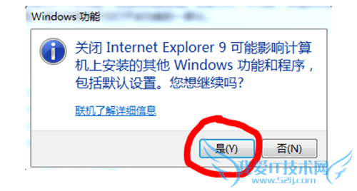 5、取消对钩后,系统会弹出提示窗口,如果确认要卸载的话,就点击“是”。点击“是”确定后,系统就会自动关闭IE浏览器了。