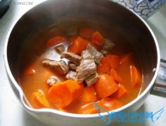 3.将海蛎干,排骨、胡萝卜(切细细的)和大米一起下炖锅熬;