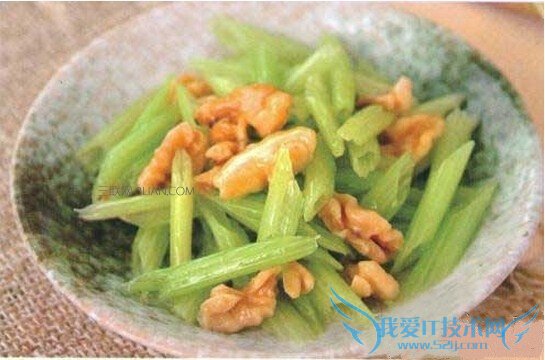 芹菜300克,核桃仁50克,精盐、味精、香油各适量。将芹菜择洗干净,切成3厘米长的段,下沸水锅中焯2分钟捞出,注意不要焯得太熟;焯后的芹菜用凉水冲一下,沥干水分,放盘中,加精盐、味精、香油;将核桃仁用热水浸泡后,去掉表皮,再用开水泡5分钟取出,放在芹菜上,吃时拌匀。芹菜含有丰富的维生素C、铁及植物纤维素,有润肤、明目、养血的作用,植物纤维素有利排便;核桃仁含有胡萝卜素、维生素B1、维生素E。此菜有利于治疗产后便秘和高血压。