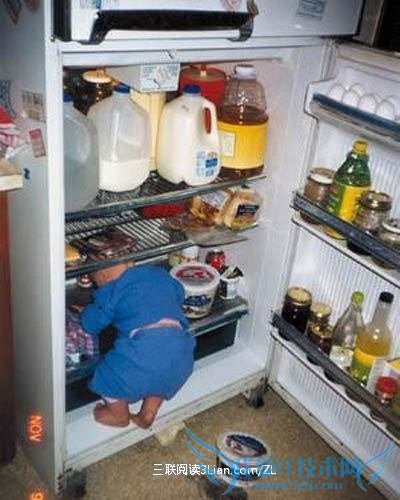 O,妈妈呀,我肚子饿了,到冰箱找东西吃,一不小心卡住了!