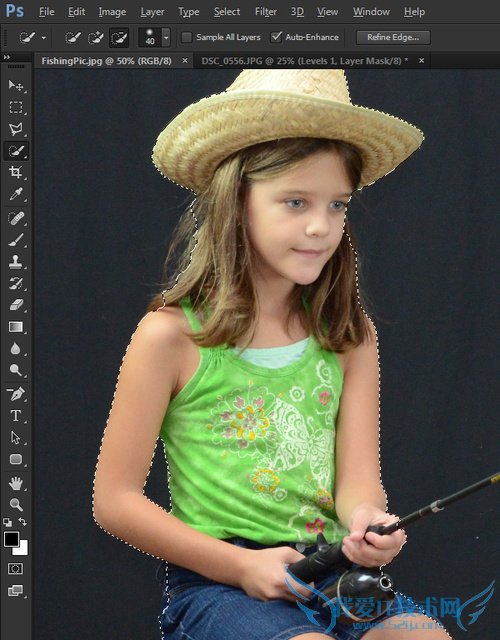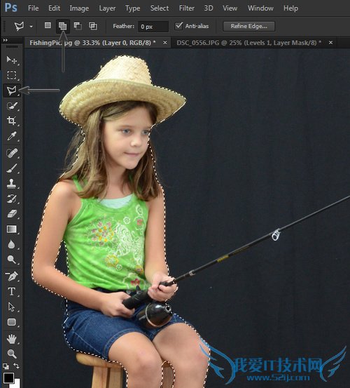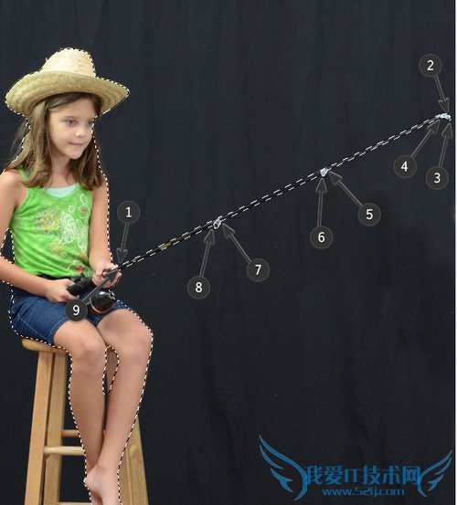 现在用这个工具来选择鱼竿。这个工作跟前面的稍微有点不同,对比起尝试直接圈起来,这个工具更加像是点连着点。点击隆起的角,慢慢连接起这个鱼竿的外观。但觉得完成之后,双击完成选区。现在你看到选区已经包含鱼竿啦!