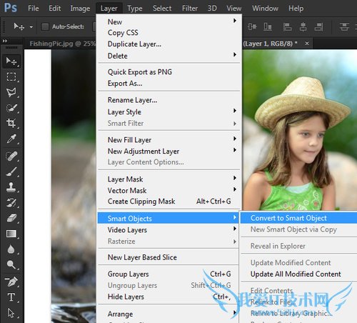 在继续之前,把复制的图像转换成一个智能对象。这有助于在调整图像大小的时候保持图像的清晰度。在主菜单栏中选择“图层>智能对象>转换为智能对象”。