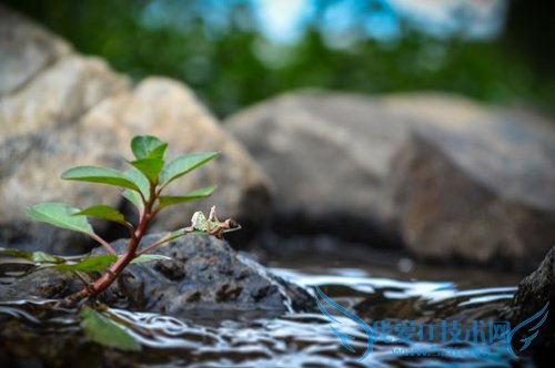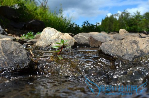 再靠近仔细看看这颗植物,发现如果将相机放在水面的的岩石上,就会获得低的视角,同样的植物、流水、岩石,就因为视角的变化产生新的景观。这样看,这颗植物也是蛮有趣的。