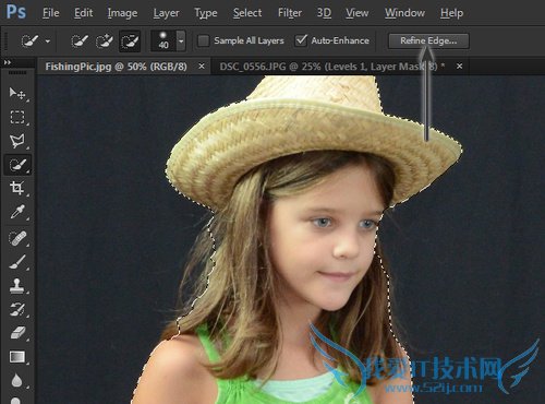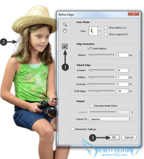 选项框左边是一个小图标,看起来像一个油漆刷。这是调整半径工具。确保工具被选中,然后在之前很难选择的头发区域。这将创建一个软化的选取,然后点击确定。