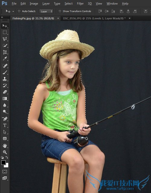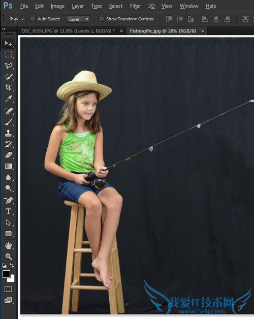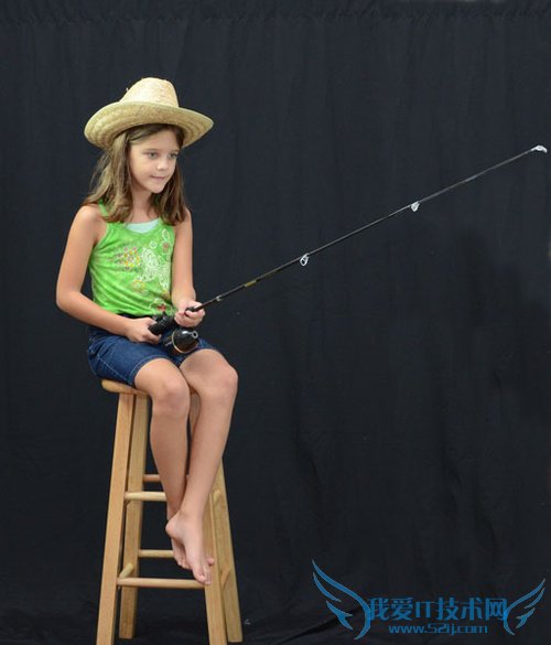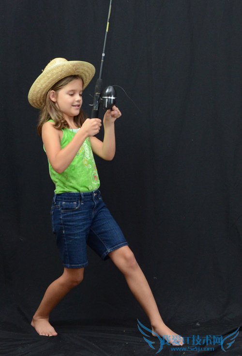 因为后面需要将人物从背景抠出,所以这里作者选择了尽量没有杂物的背景作为拍照背景,她在车库里搭了一个背景,背景用了黑色的幕布,然后再配置几盏射灯,这样就弄好小小工作室啦。然后让她的女儿拿着鱼竿,戴着帽,摆pose。