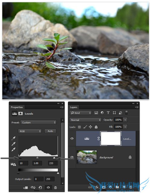 在PS菜单栏中选择“图层>新调整图层>色阶”。在水平属性框中,右下方的直方中有三个小滑块。把最外面的小滑块微微向内滑动,增加图像的对比度。