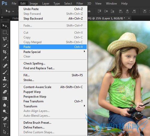 在Photoshop标签栏中找到背景图像,然后点击。再选择“编辑>粘贴”来将抠出图像复制到背景中。