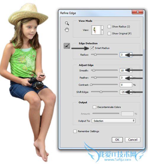 当调整边缘的选项框出来后,将智能半径选中标记,然后如下设置。这些选项设置以后,先不要点击确定。