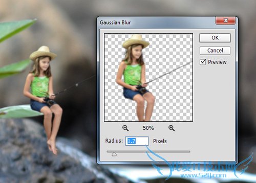 由于图像的清晰度问题,孩子还是稍微有些不同。这里可以用模糊滤镜调整。在图层面板上点击孩子的图层,然后选择“滤镜>模糊>高斯模糊”。使用半径为1.7像素。