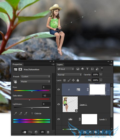 减少饱和度,直到孩子的颜色与背景色饱和度相匹配。对于教程的图像,-12是一个不错的调整数值。