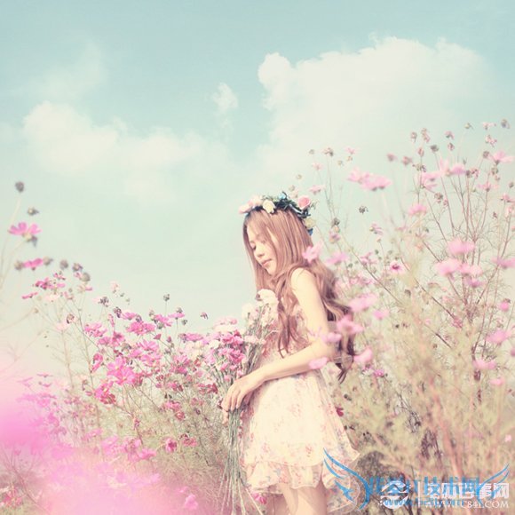 解决方案:将黄色减淡,突出花丛和天空的颜色,以粉红和粉蓝为目标色。注意保留细节,统一其他颜色,如草的黄绿色,头发的黄色。