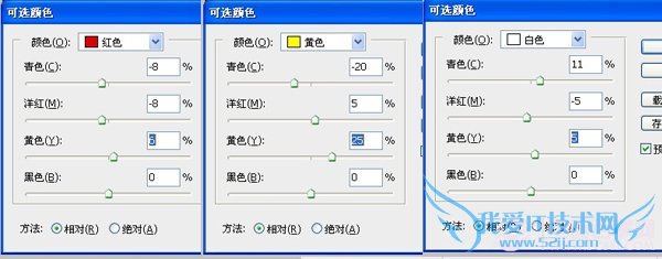 第二步 3、打开图象--调整--可选颜色--调整图层,对红、黄、白进行调整,具体数值如下,这一步增加图片高光部分的淡黄色。
