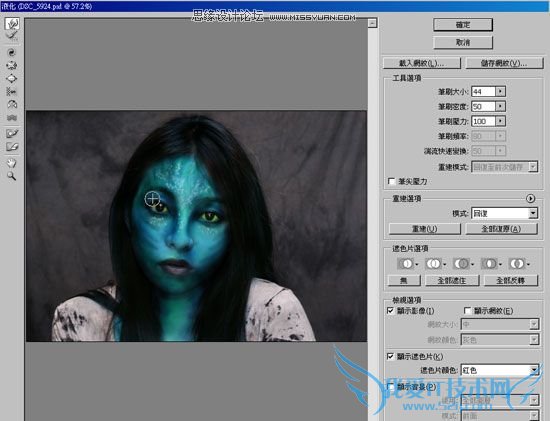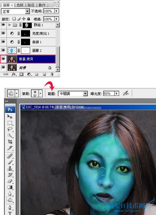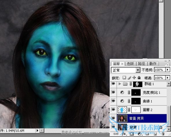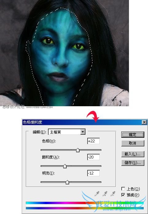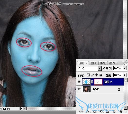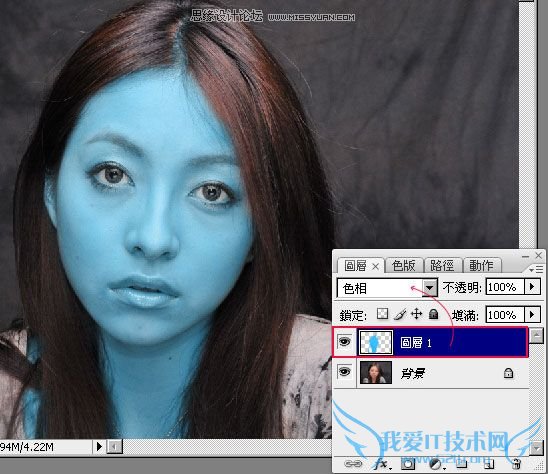 新增一个图层,将图层混合模式设为【色相】,接着利用工具箱 / 笔刷,并将前景设为【青蓝】色,然后直接把脸涂成蓝色。
