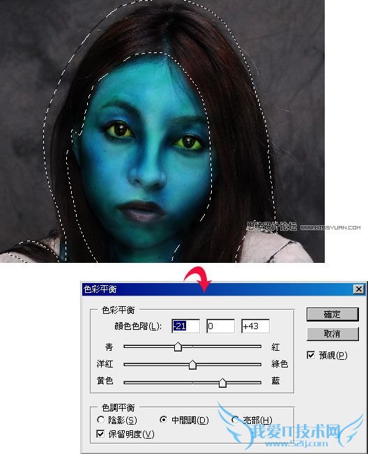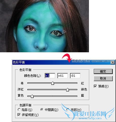 利用套索选取工具将眼睛选取起来,再新增一个【色彩平衡】调整图层,再加入大量的黄光与绿光如下图。
