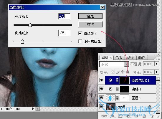 完成后按住Ctrl键,再对着刚的曲线调整图层缩图点一下,新增一个【亮度/对比】调整图层,该调整图层则是用来降低嘴纯的亮度与对比。