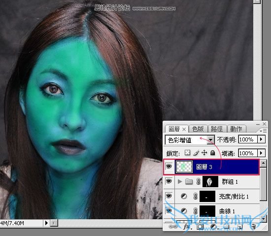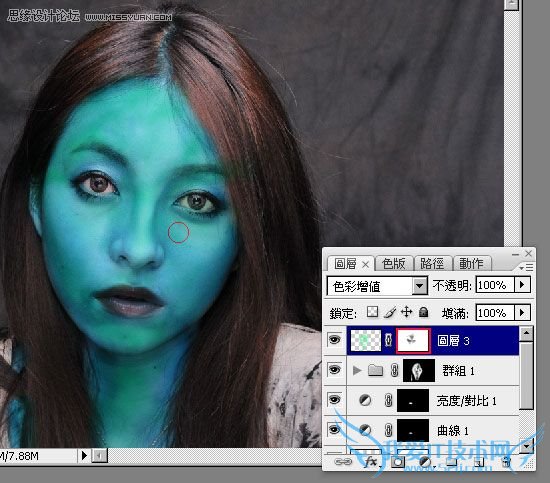再新增一个新图层,将前景色为【蓝绿色】,利用笔刷工具,将脸的部分再涂上一些蓝缘色,完成后再将该图层混合模式设为【色彩增值】。