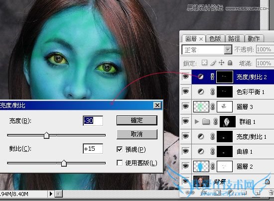按住Ctrl键对着刚的【色彩平衡】调整图层缩图点一下,新增【亮度/对比】调整图层,降低亮度提高对比。