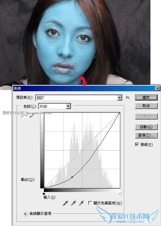 利用套索工具,将嘴纯选取起来,再新增一个曲线调整图层,将曲线向下拉,把嘴纯的明度降低。