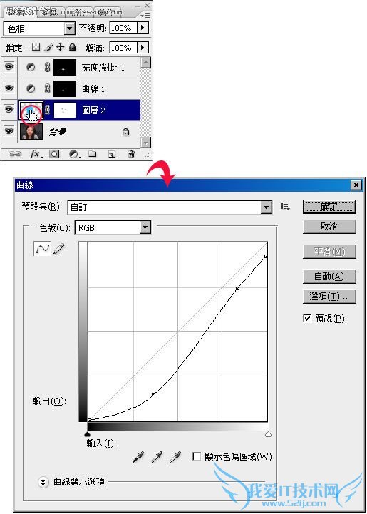 完成后按住Ctrl键,再对着图层1的缩图点一下,新增一个【曲线调整图层】,将脸的亮度对比降低。