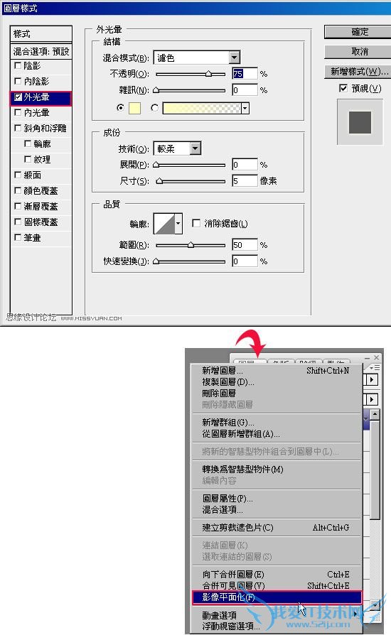好了之后直接涂在鼻子以及眼下,完成后将该图层,新增图层样式将外光晕勾选起来,再将图层平面化。